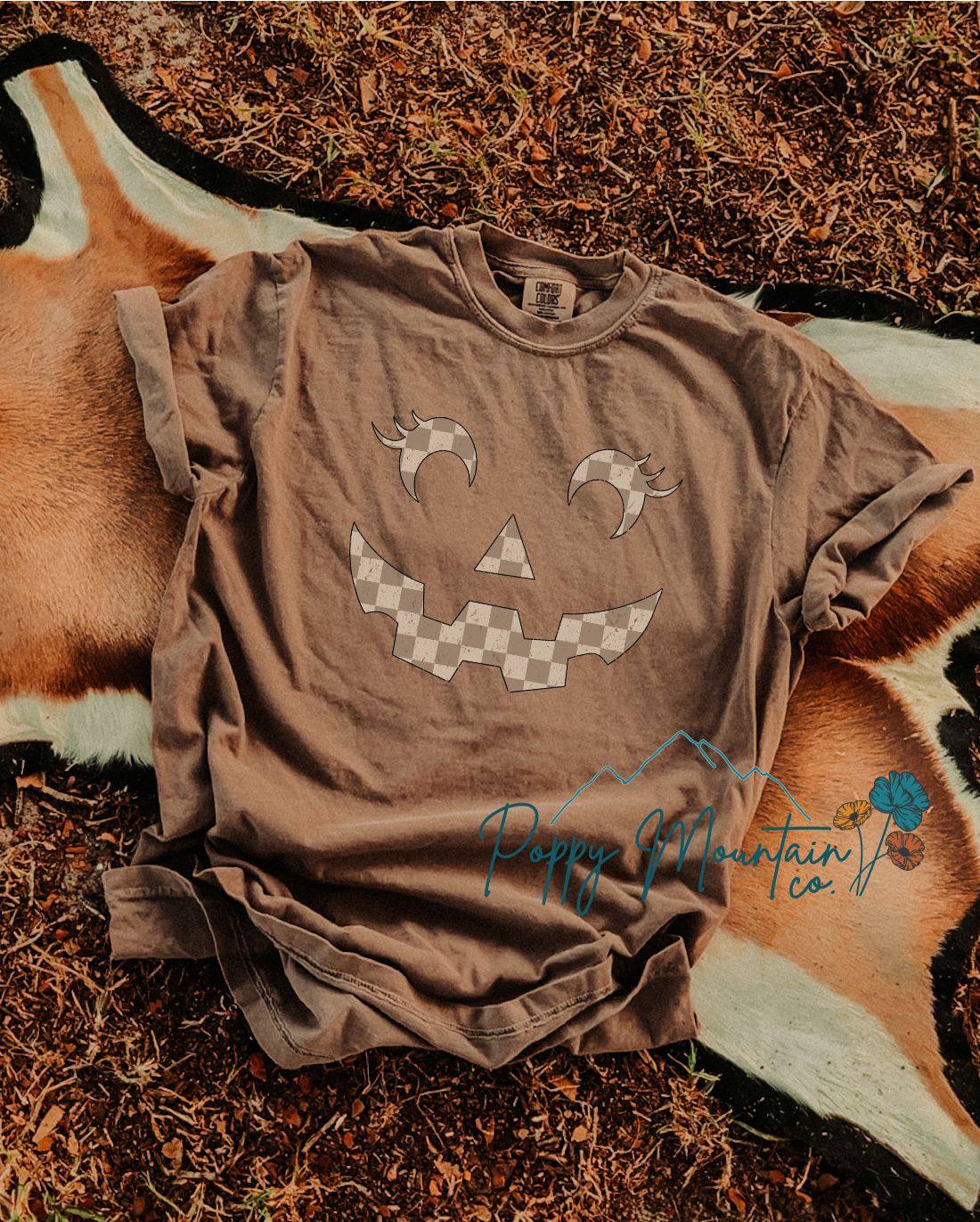 - SHOWN HERE: KIDS Brown Checkered Pumpkin Face on Bella Canvas Heather Maroon Short Sleeve Tee
