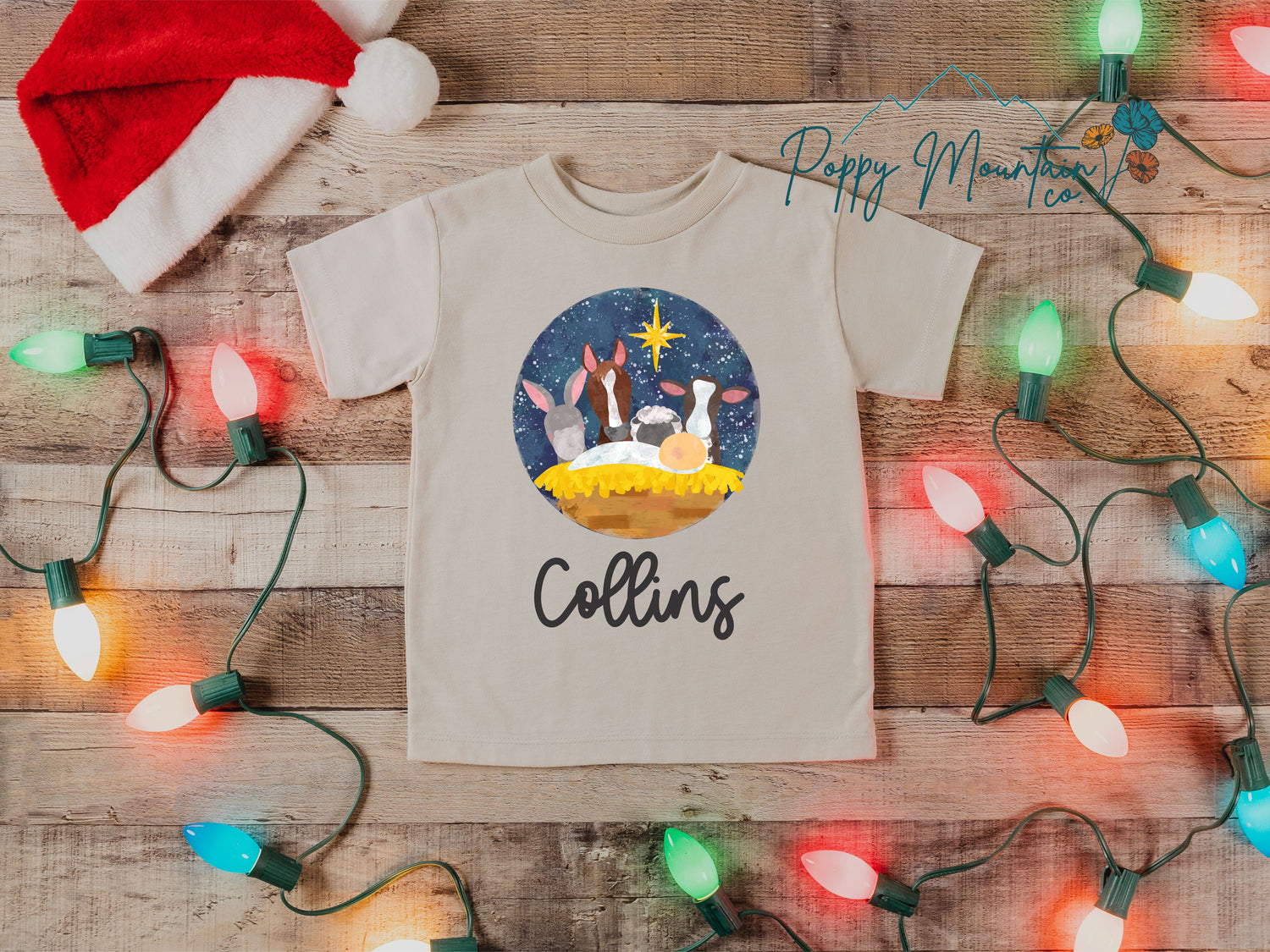 - SHOWN HERE: KIDS Custom Nativity on Bella Canvas Heather Dust Short Sleeve Tee