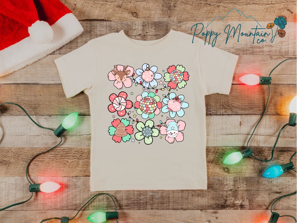 - SHOWN HERE: KIDS Retro Floral Ornaments on Bella Canvas Natural Short Sleeve Tee