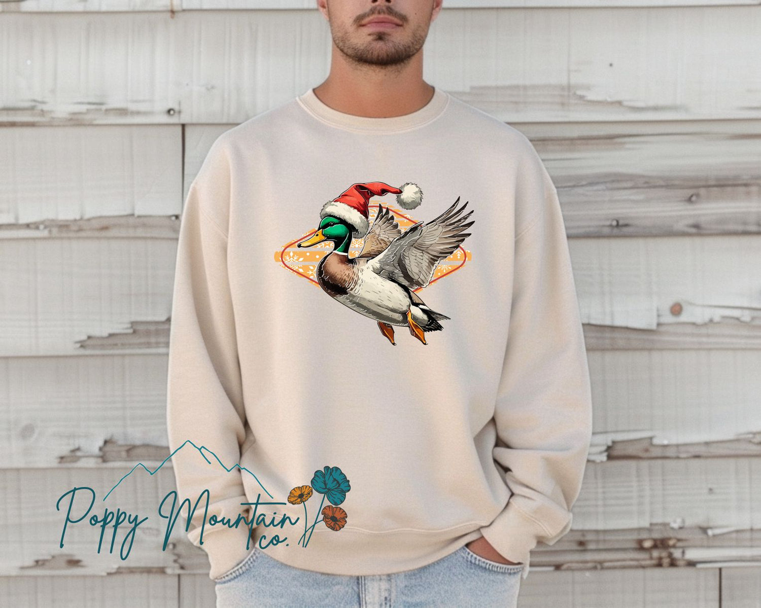 - SHOWN HERE: KIDS Santa Mallard on Gildan White Sweatshirt