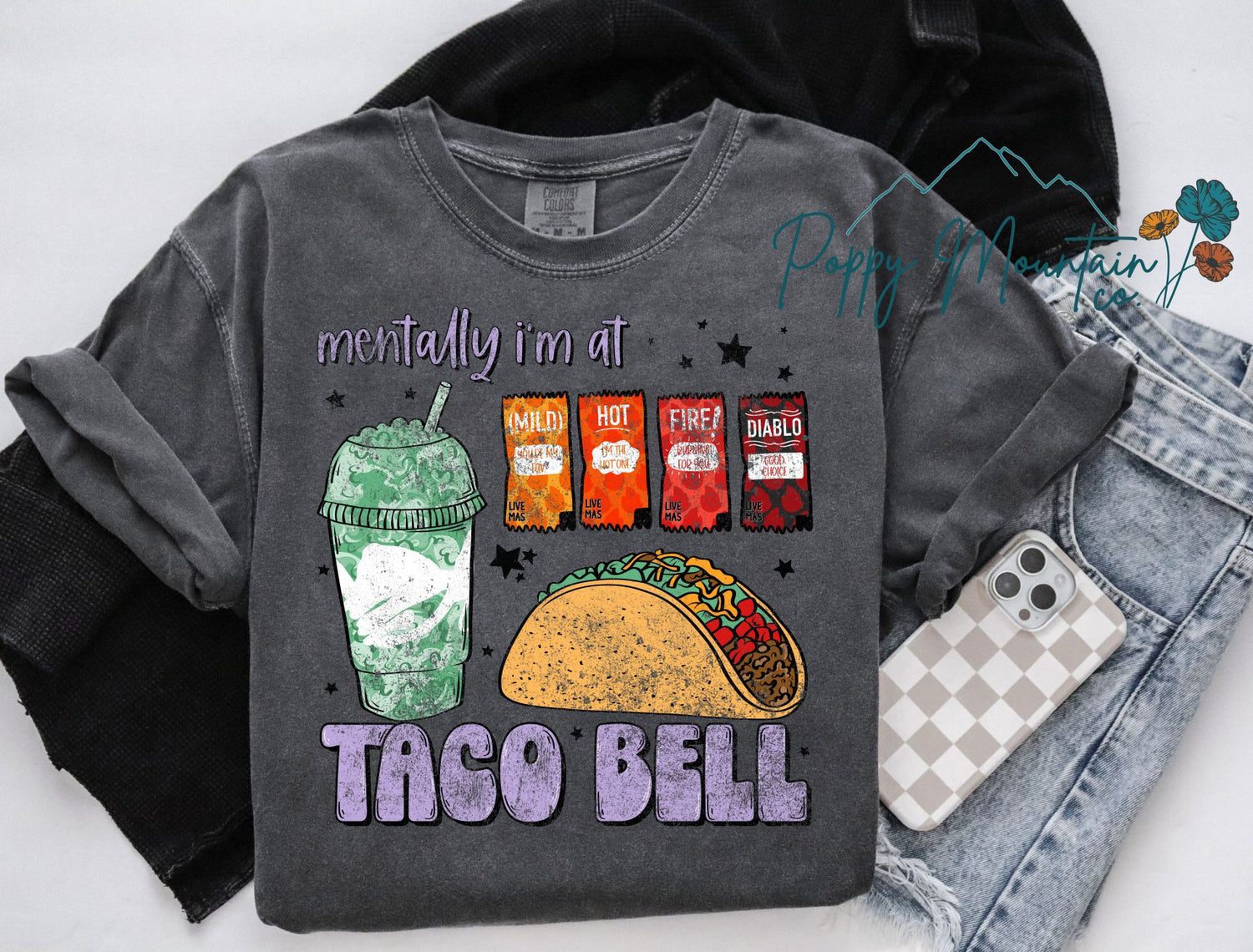 - SHOWN HERE: Mentally at Taco Bell on Comfort Colors Pepper Short Sleeve Tee