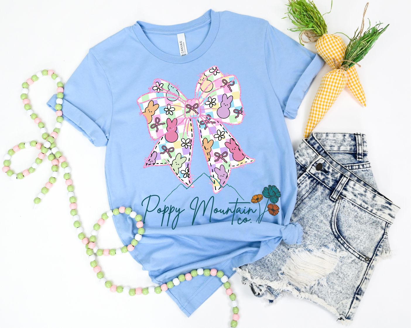 - SHOWN HERE: Peeps Bow on Bella Canvas Baby Blue Short Sleeve Tee